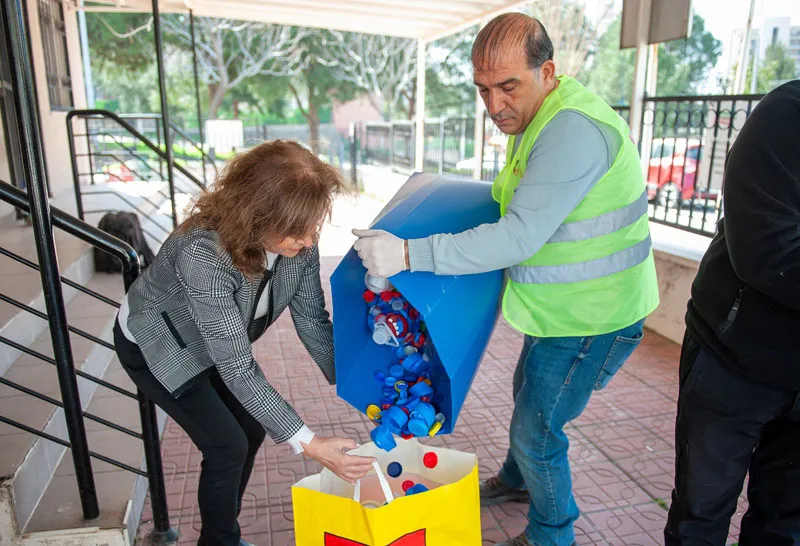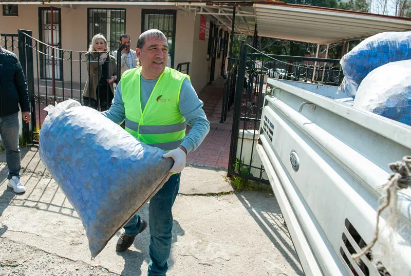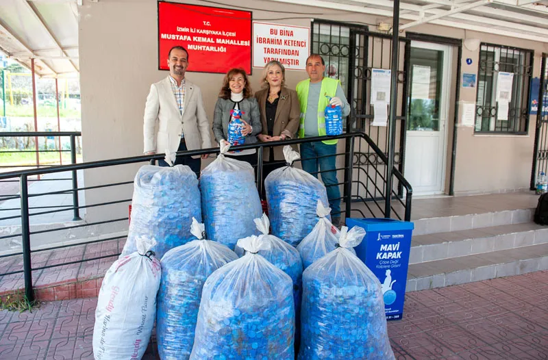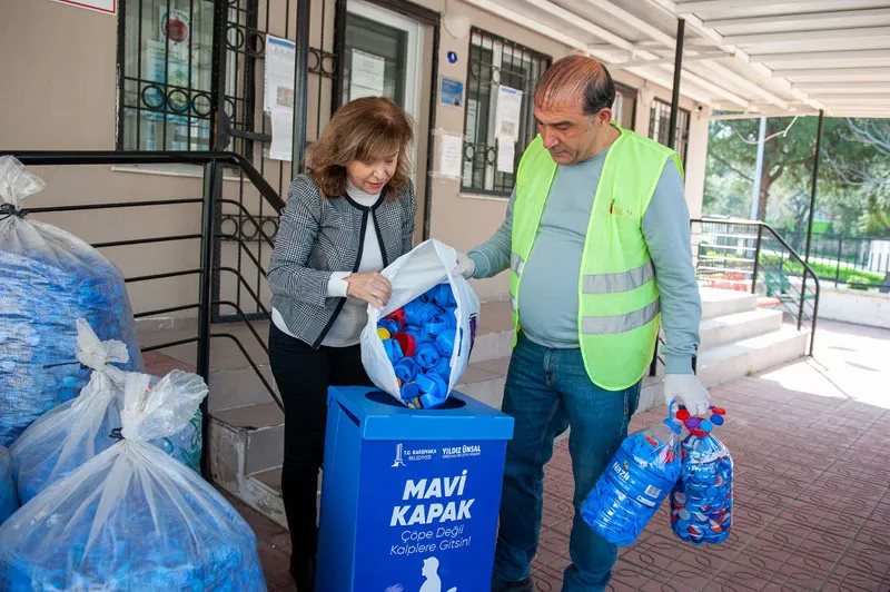 Uzun yıllar önce İzmir’de başlatılan ve ülke çapında büyük destek gören “Mavi Kapak” kampanyası, Karşıyaka Belediyesi tarafından geçen Ağustos ayında yeniden hayata geçirildi. Bu kapsamda kültür merkezleri, mahalle merkezleri ve anaokulları gibi belediye tesisleri ile muhtarlıklara kapak toplama kutuları yerleştirildi. İlçe genelinde 70 ayrı noktada bulunan kutularda, damacana kapağı da dahil olmak üzere tüm renklerden plastik şişe kapakları toplanıyor. Lisanslı geri dönüşüm firmasına teslim edilen her bir ton kapak karşılığında iki adet tekerlekli sandalye temin ediliyor. Sandalyeler, Karşıyaka Belediyesi Sosyal Hizmetler Müdürlüğü tarafından belirlenen ihtiyaç sahibi engelli vatandaşlara teslim ediliyor.